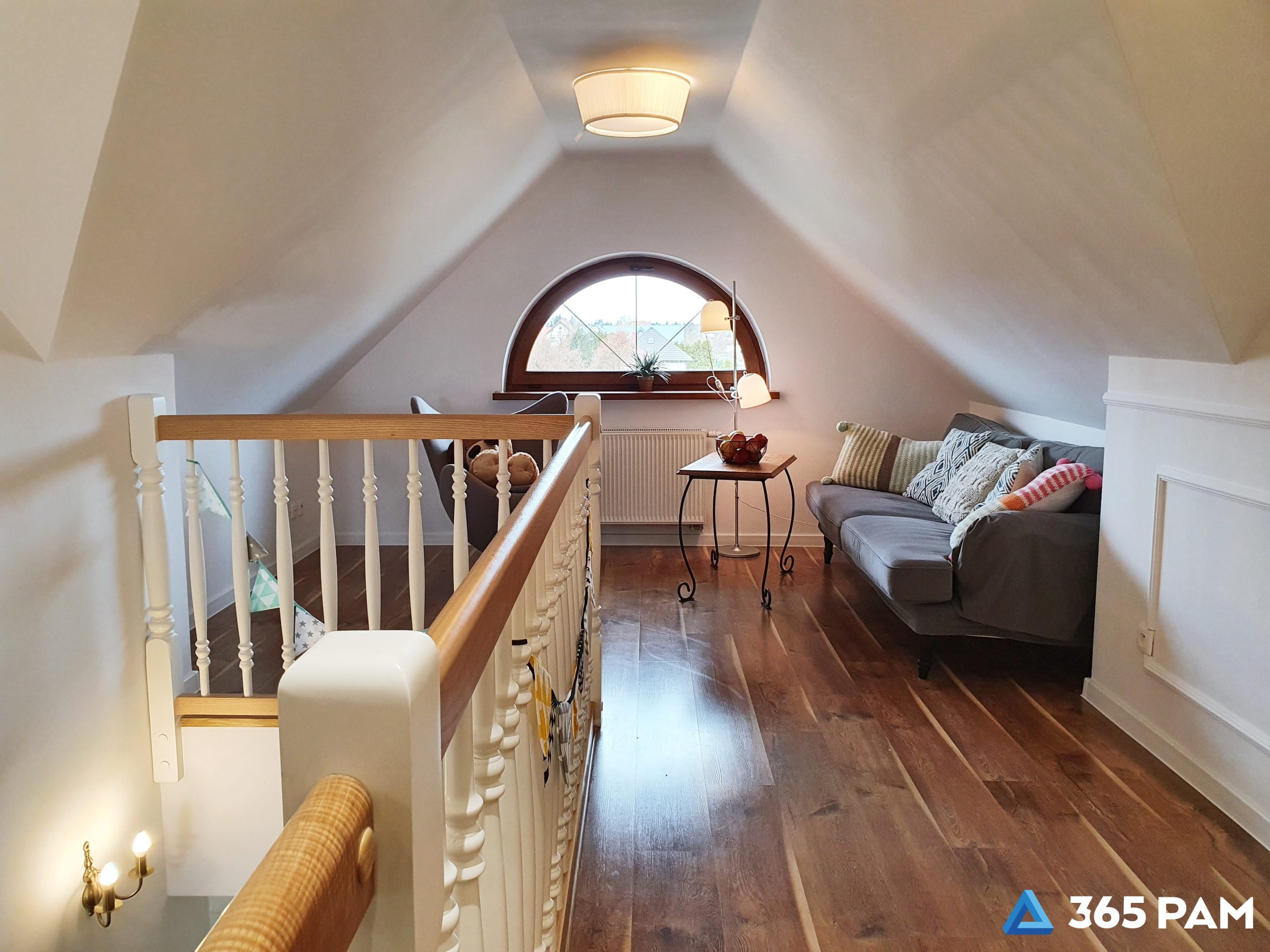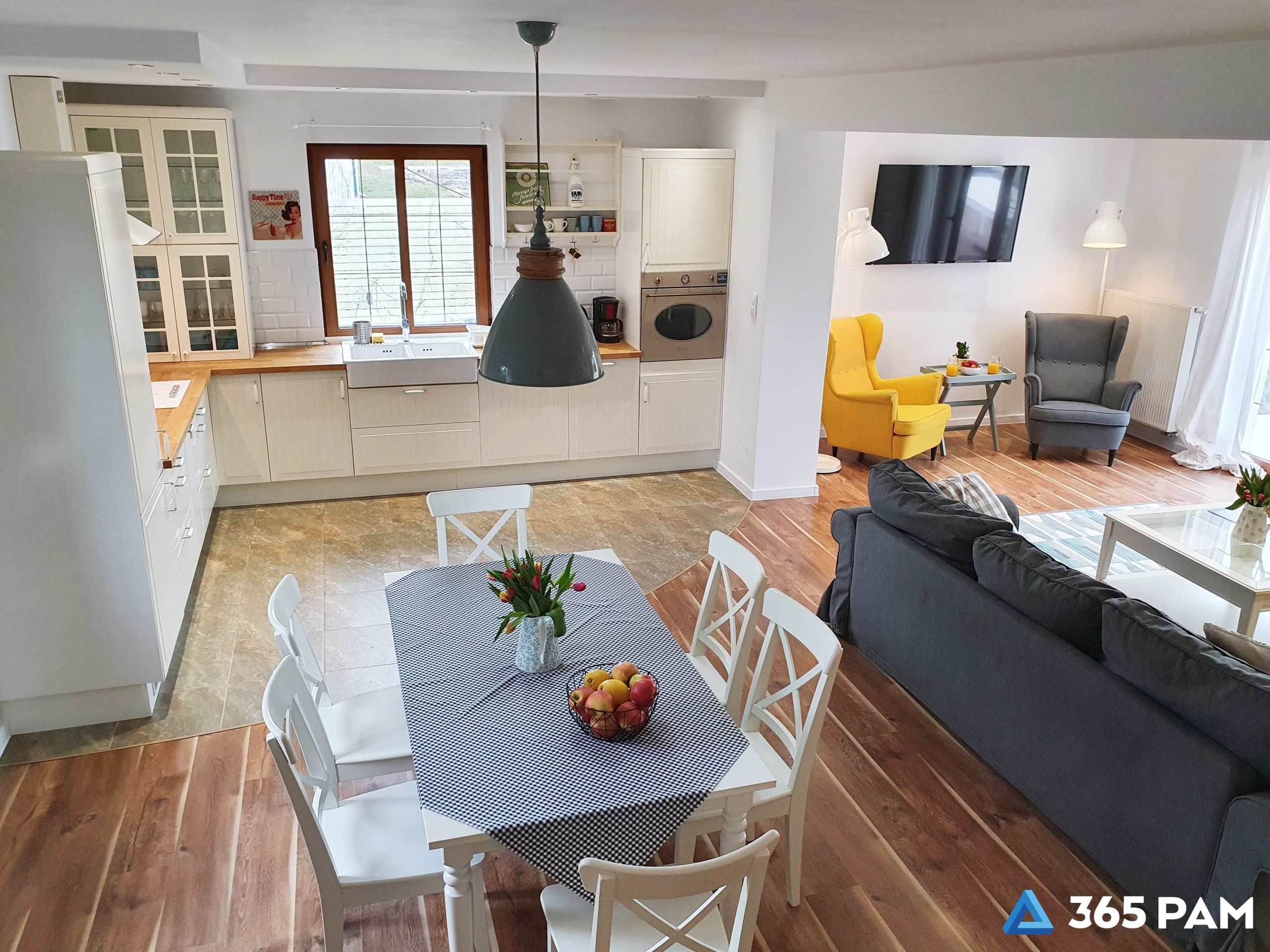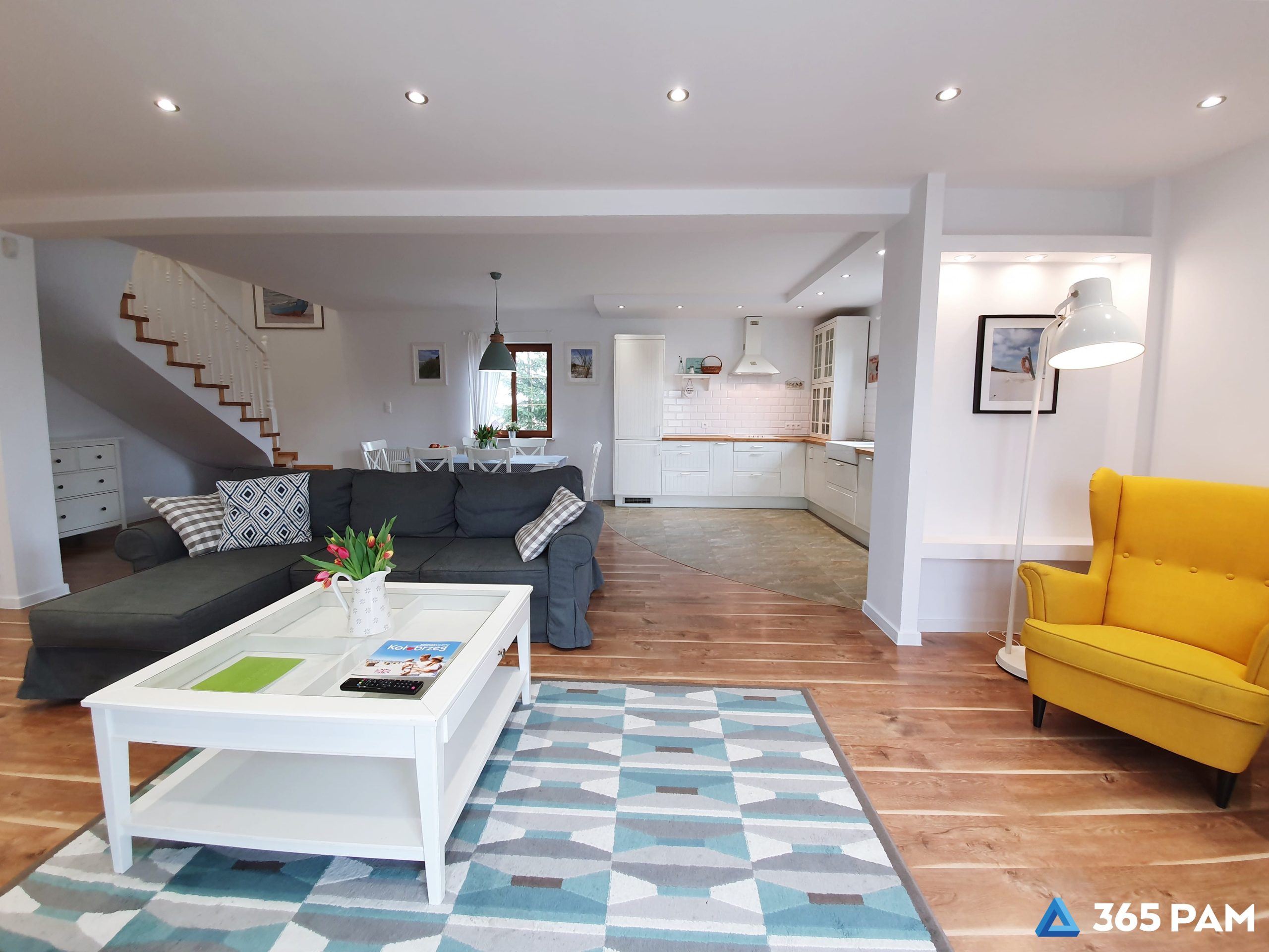Do dyspozycji gości jest także w pełni wyposażona kuchnia z jadalnią, wypoczynkowa kanapa na piętrze oraz przestronny korytarz. Na tyłach budynku znajduje się ogród, a z przodu zamykany plac z miejscami parkingowymi.