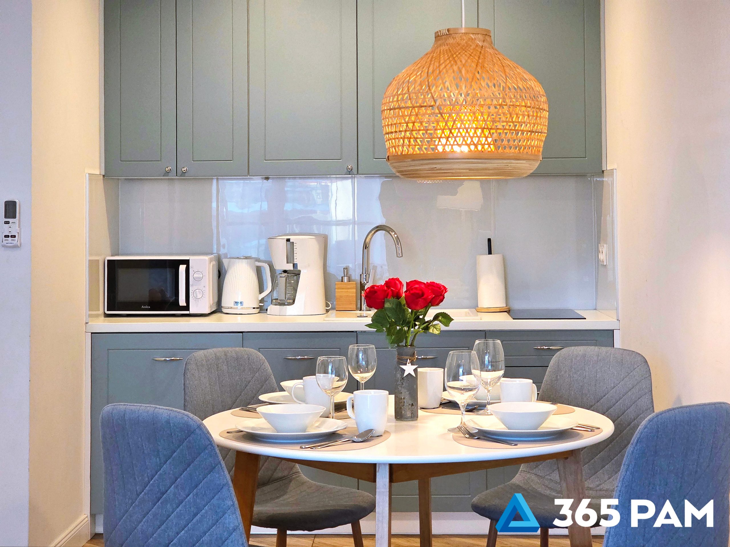 kuchenka mikrofalowa, płyta indukcyjna, zmywarka, lodówka, ekspres przelewowy, przybory kuchenne, zastawa stołowa