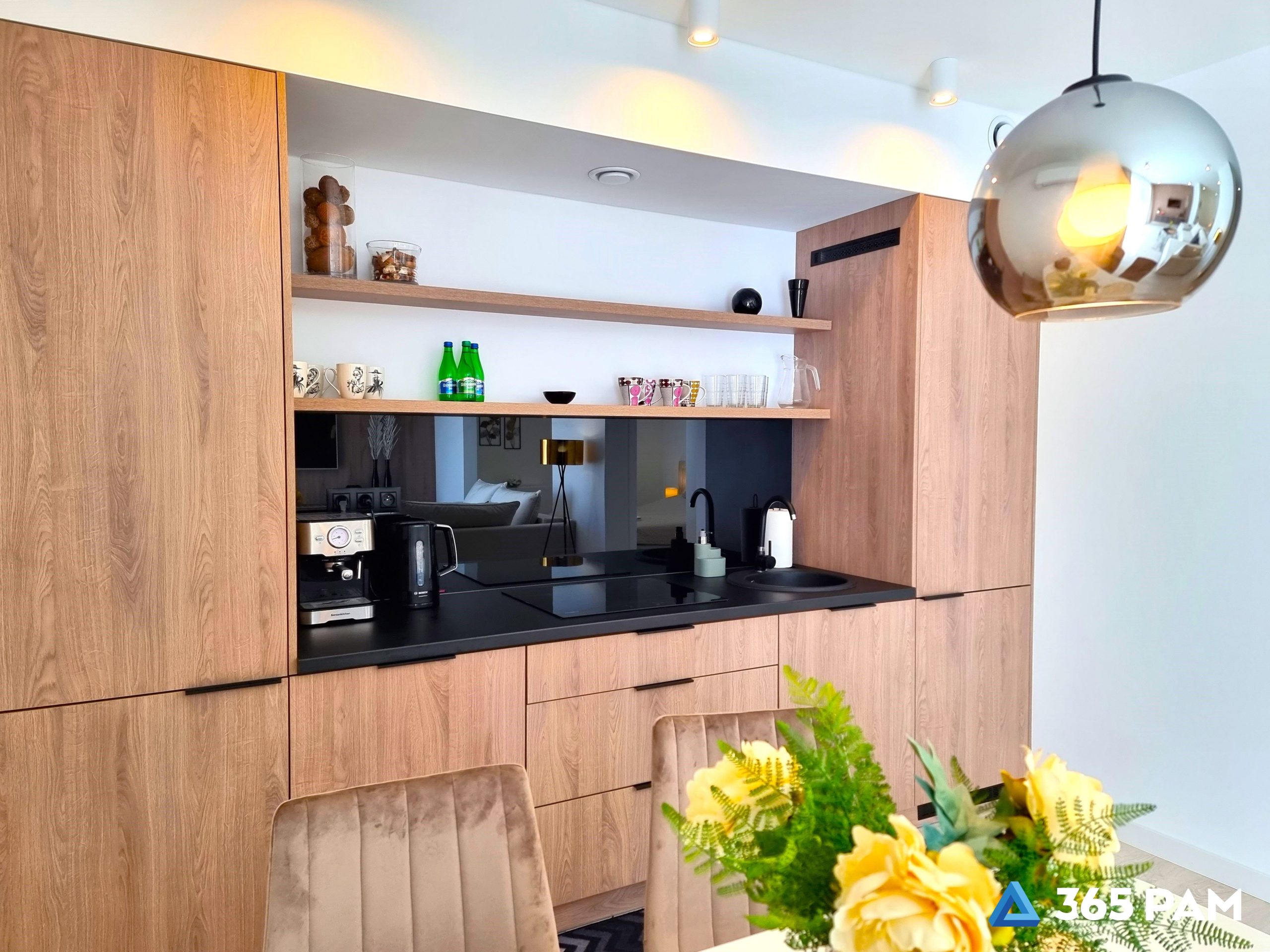 płyta kuchenna, lodówka, czajnik, zastawa stołowa, zmywarka, ekspres do kawy, kuchenka mikrofalowa, przybory kuchenne