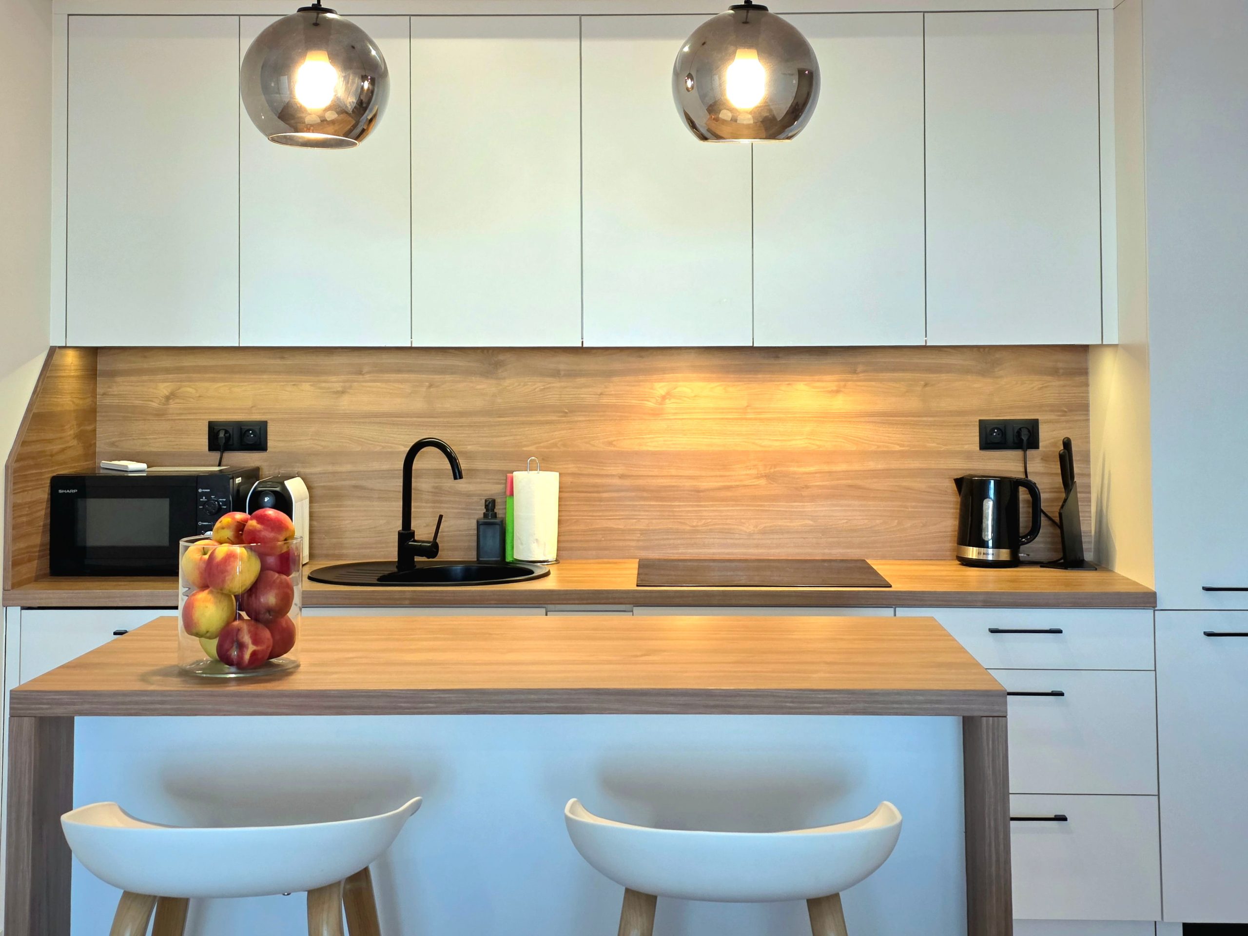 płyta indukcyjna, zmywarka, kuchenka mikrofalowa, lodówka, ekspres do kawy na kapsułki, przybory kuchenne, zastawa stołowa