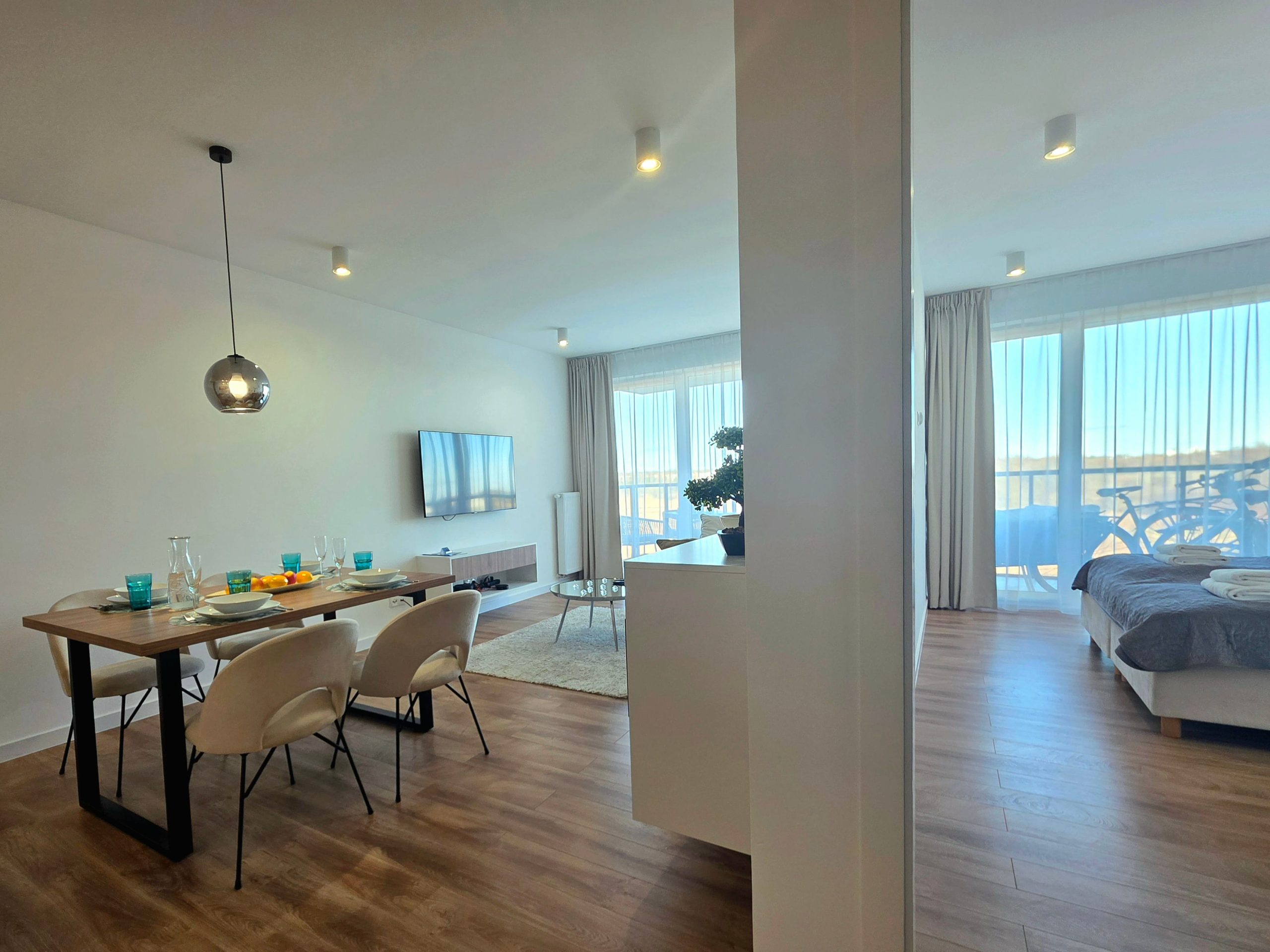kanapa rozkładana, telewizor LCD, część wypoczynkowa, część jadalna