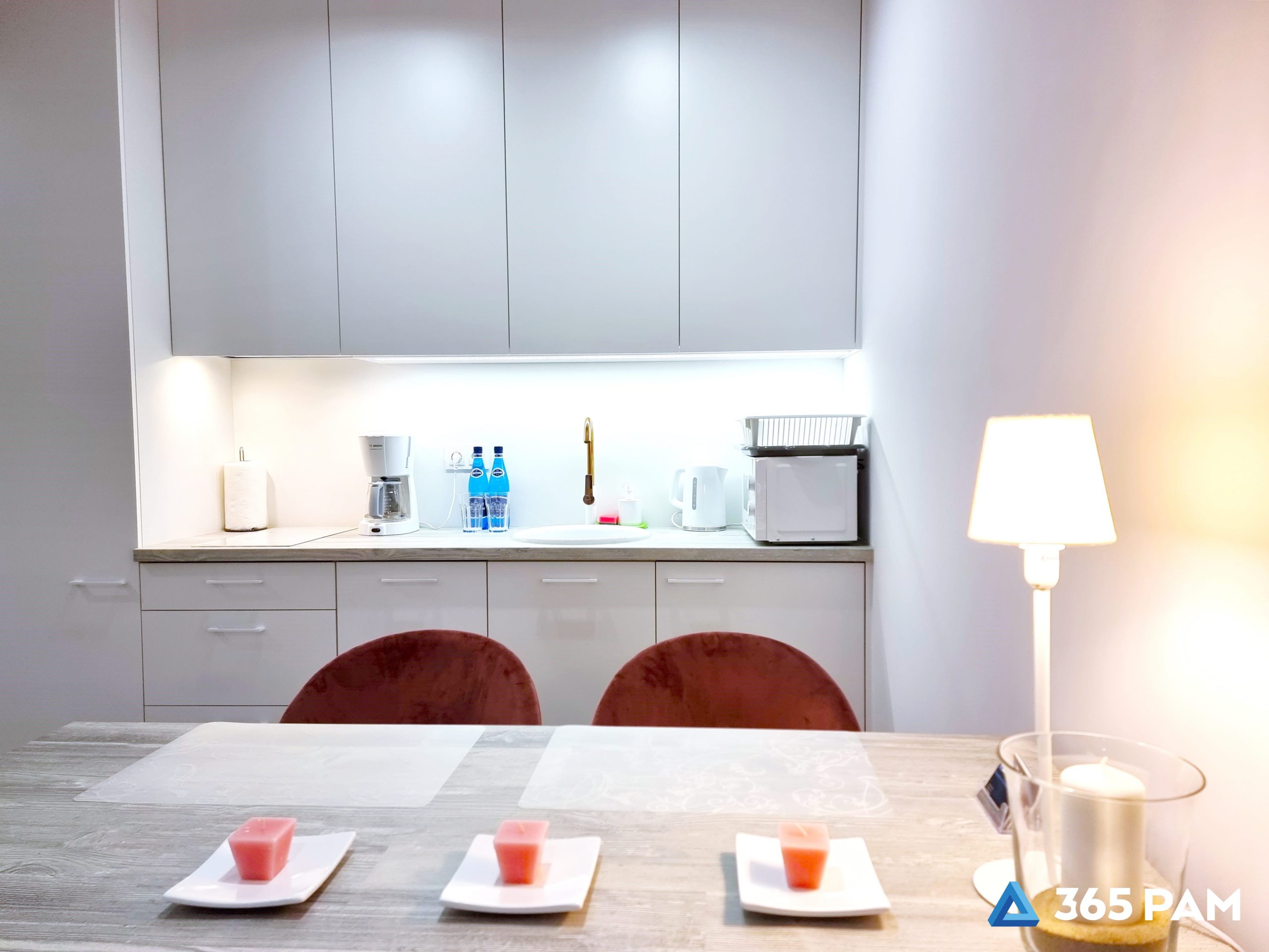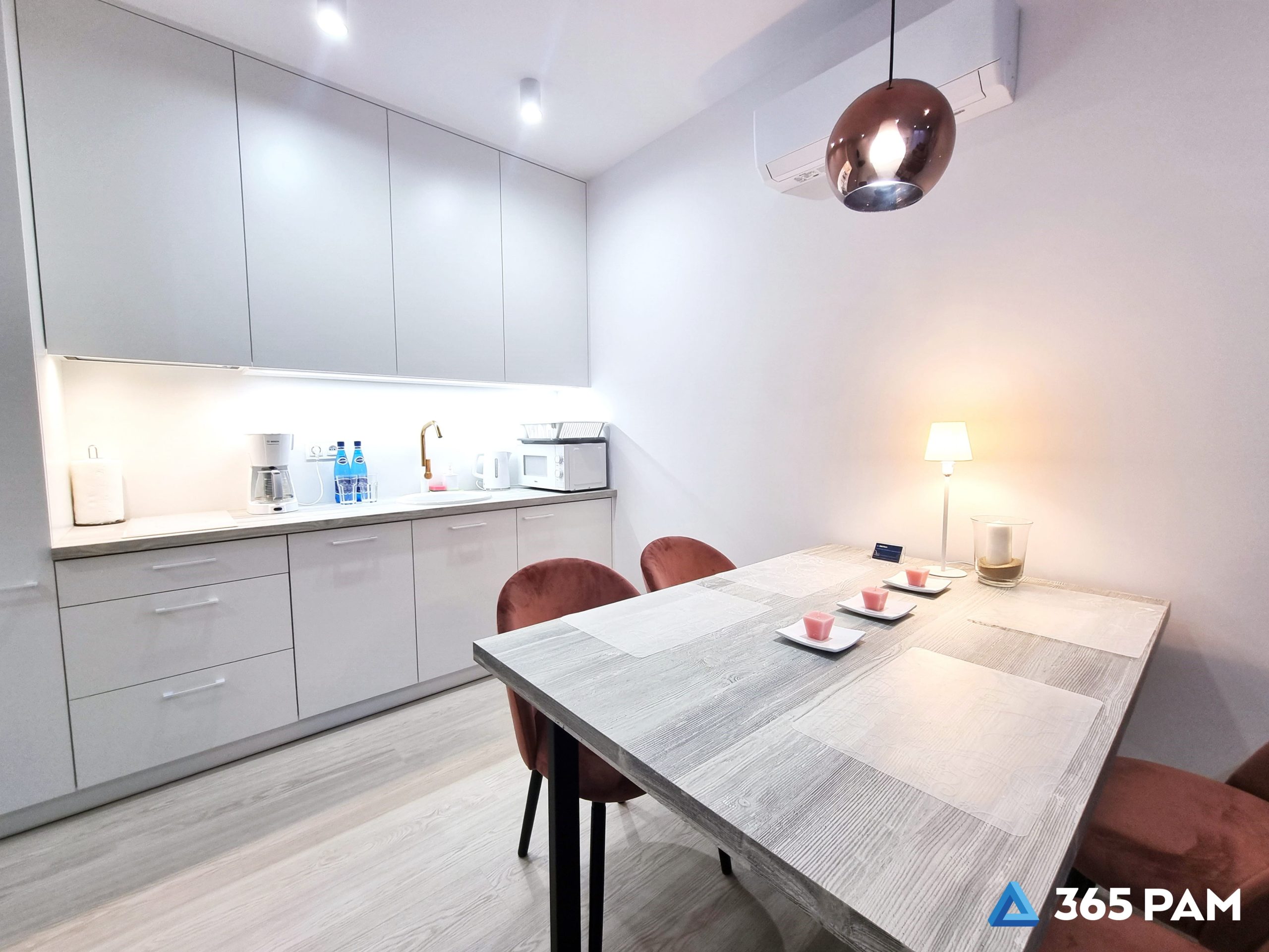 płyta indukcyjna, zmywarka, kuchenka mikrofalowa, lodówka, ekspres przelewowy, przybory kuchenne, zastawa stołowa