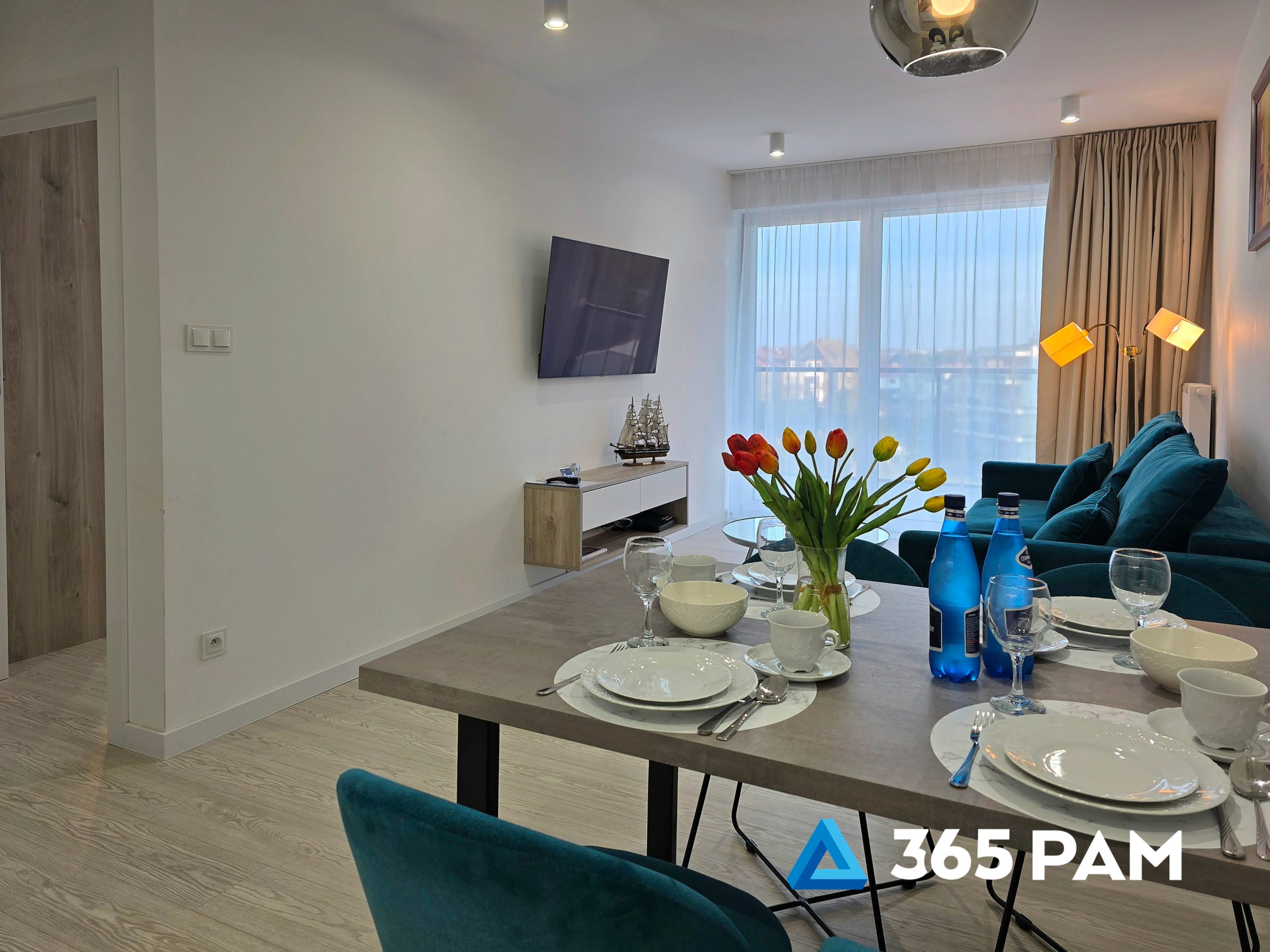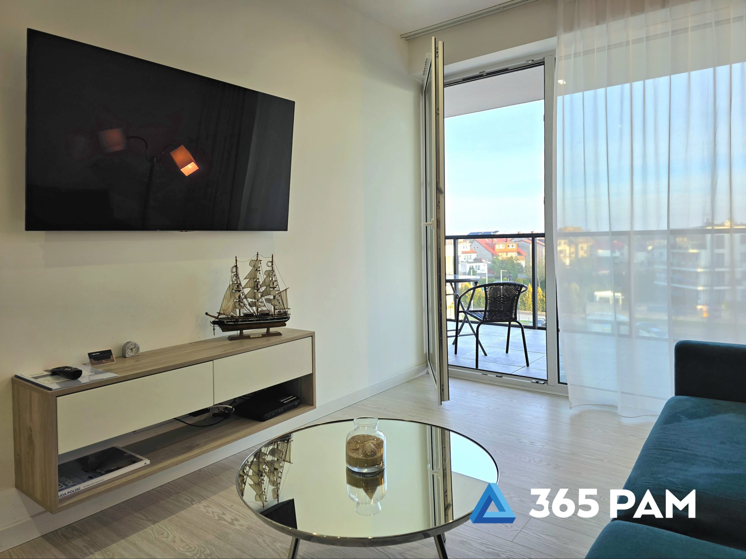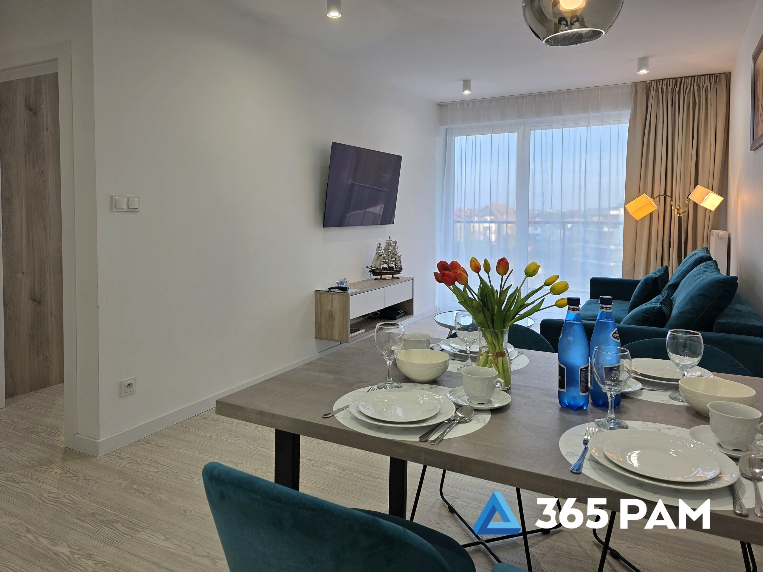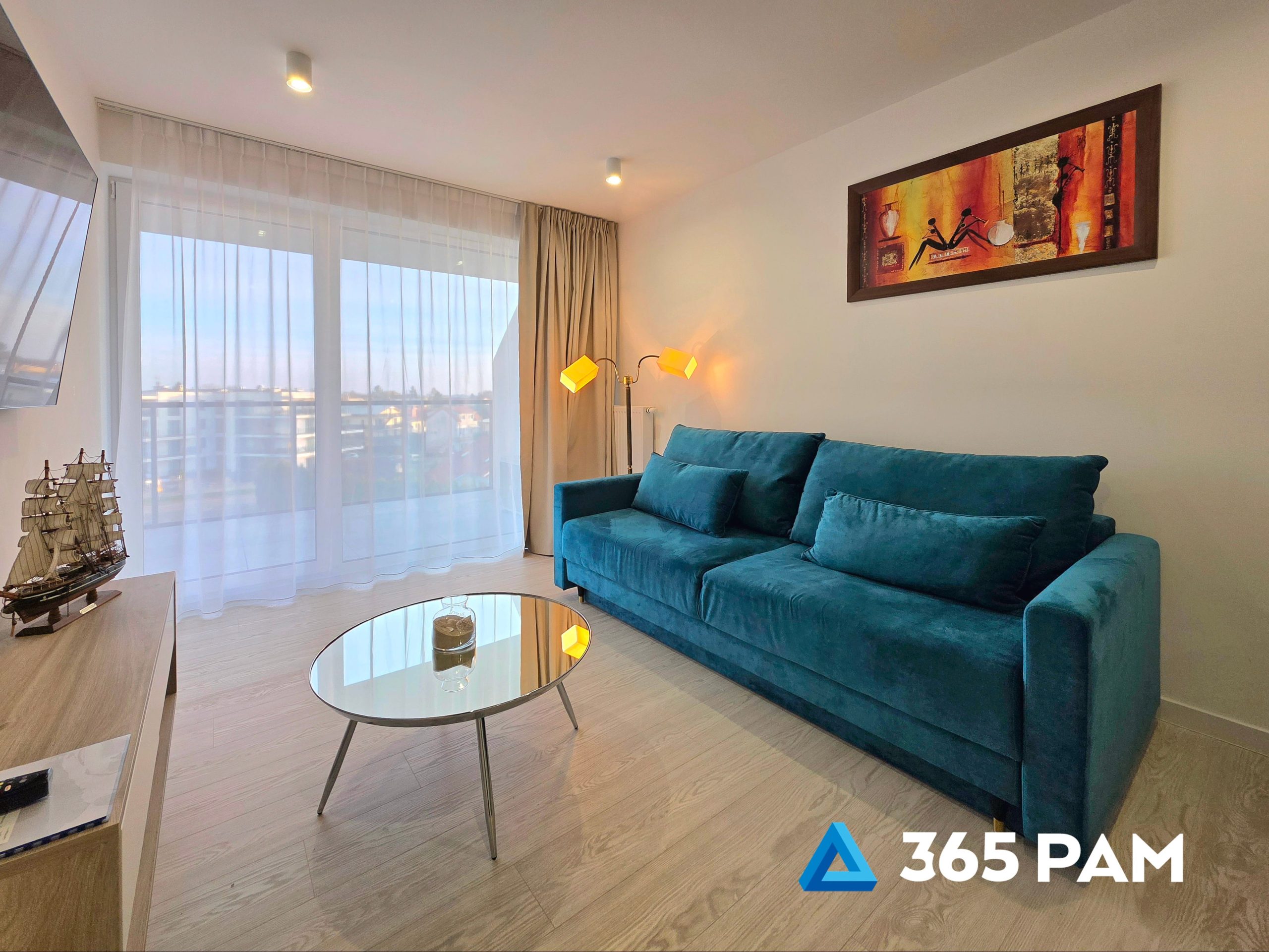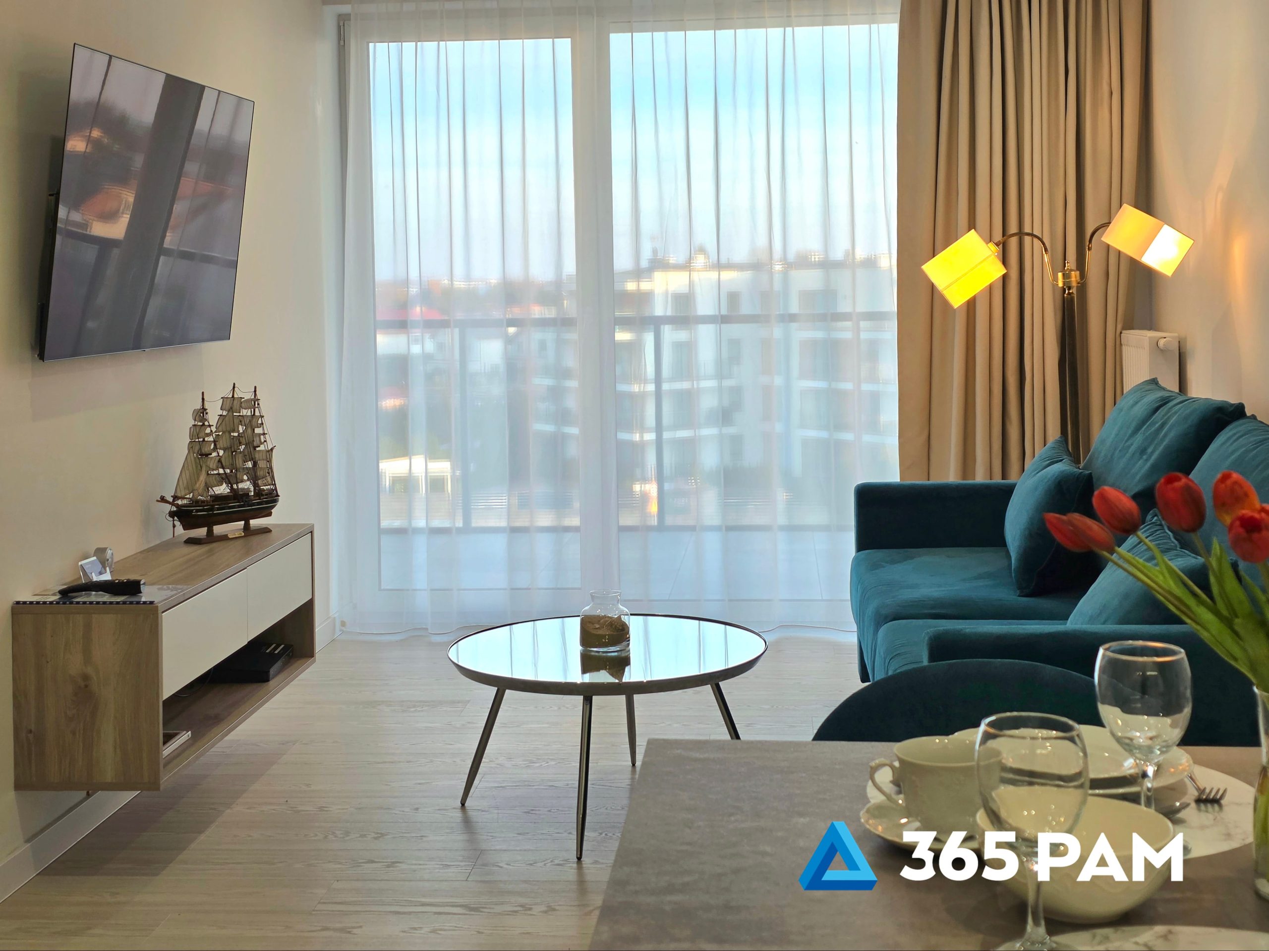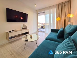 W apartamencie znajduje się komfortowy salon z aneksem kuchennym, przestronna sypialnia oraz nowoczesna łazienka. Wnętrze jest w pełni wyposażone, oferując gościom m.in. wygodne miejsce do wypoczynku, telewizor, bezpłatne WiFi oraz aneks kuchenny z płytą indukcyjną, zmywarką, lodówką i ekspresem do kawy. Do apartamentu przypisane jest również miejsce w garażu, a cały obiekt posiada windę.