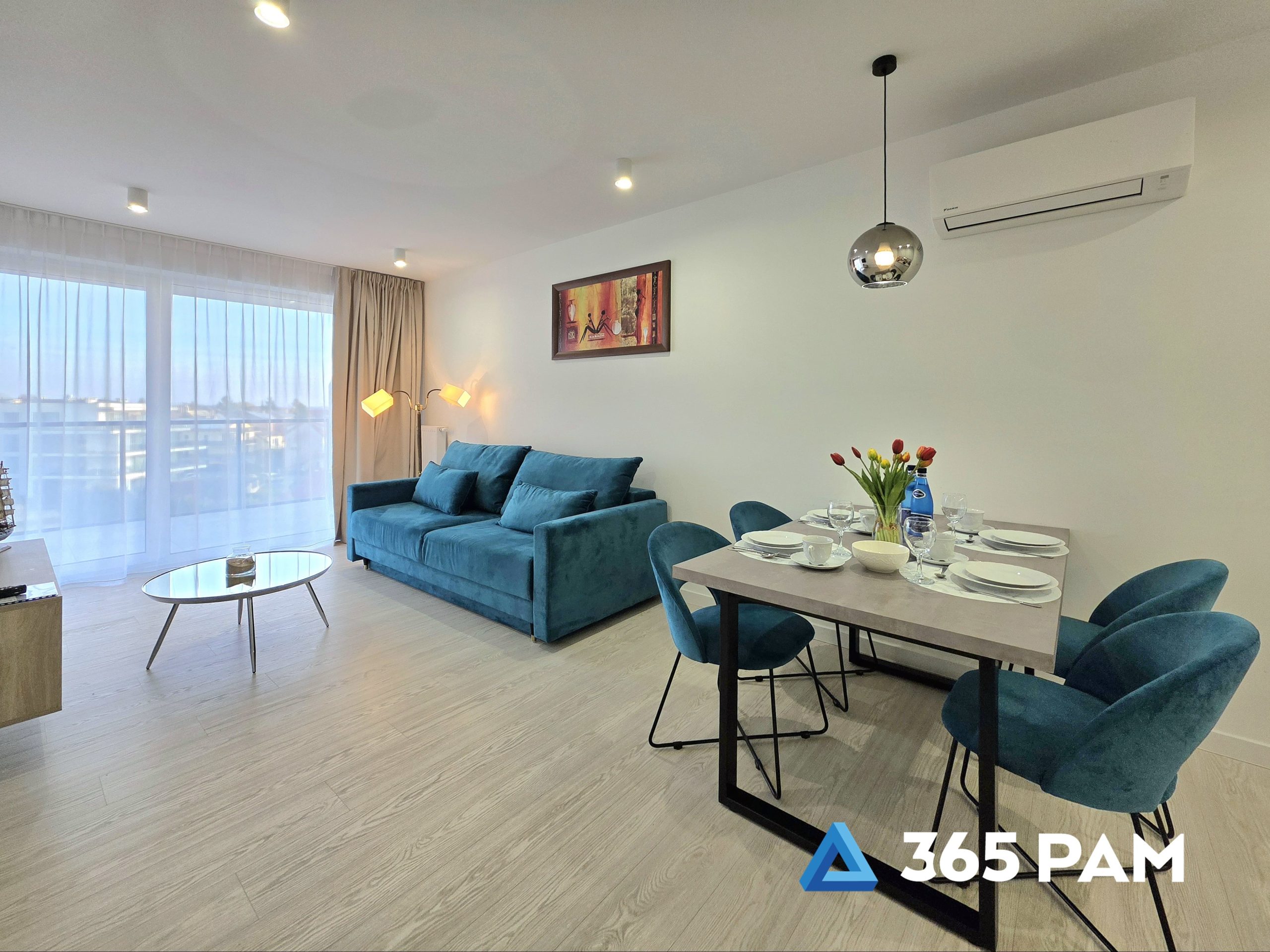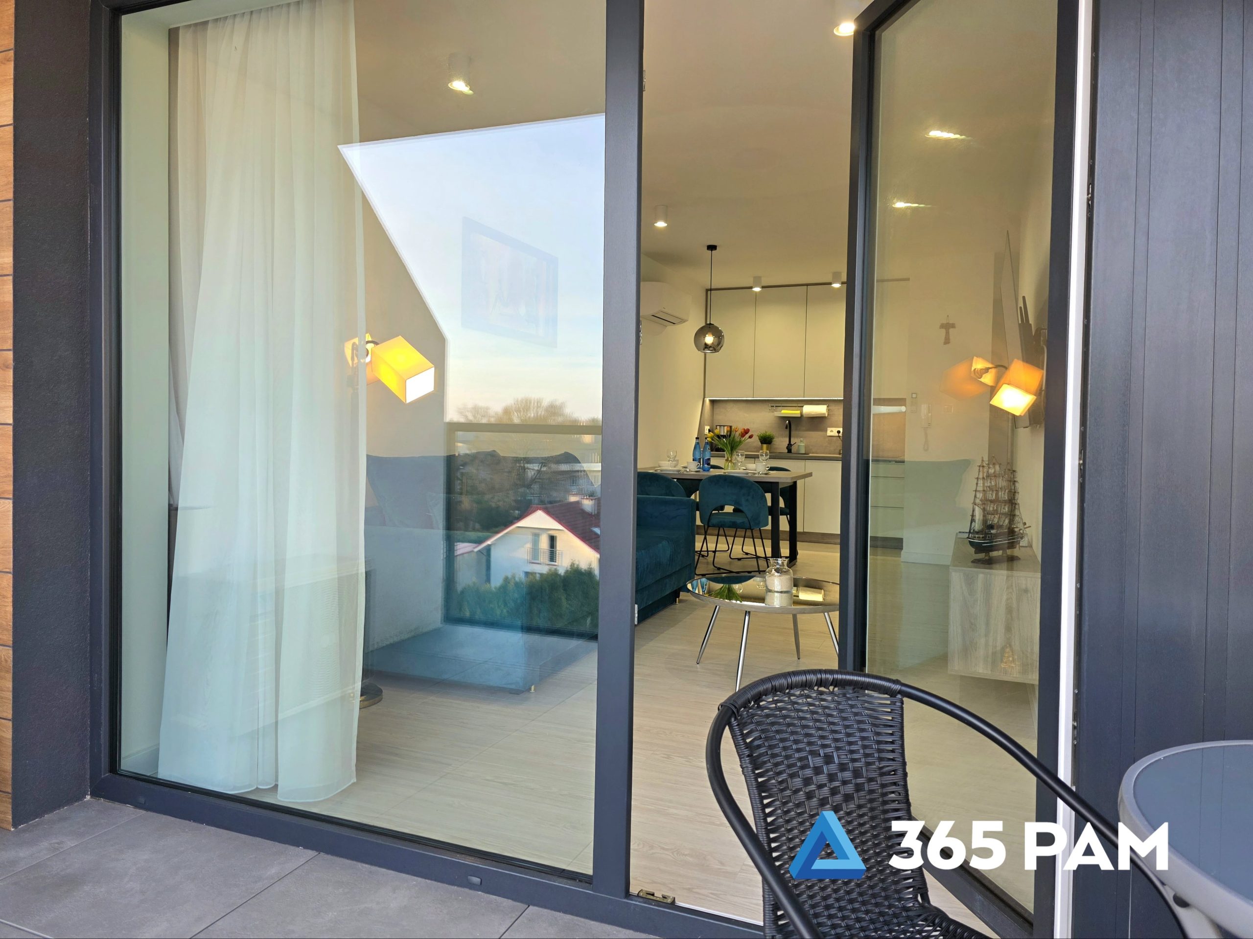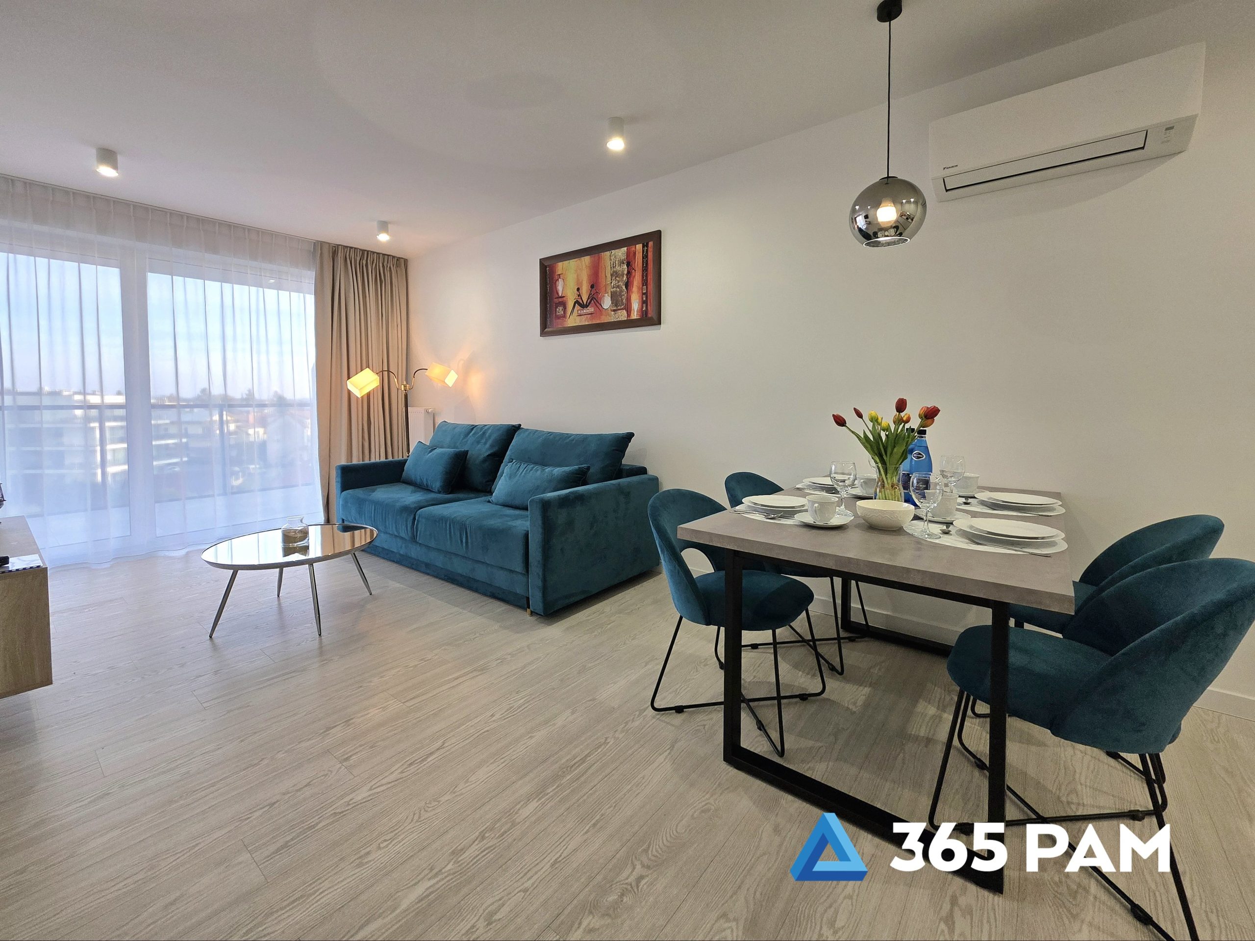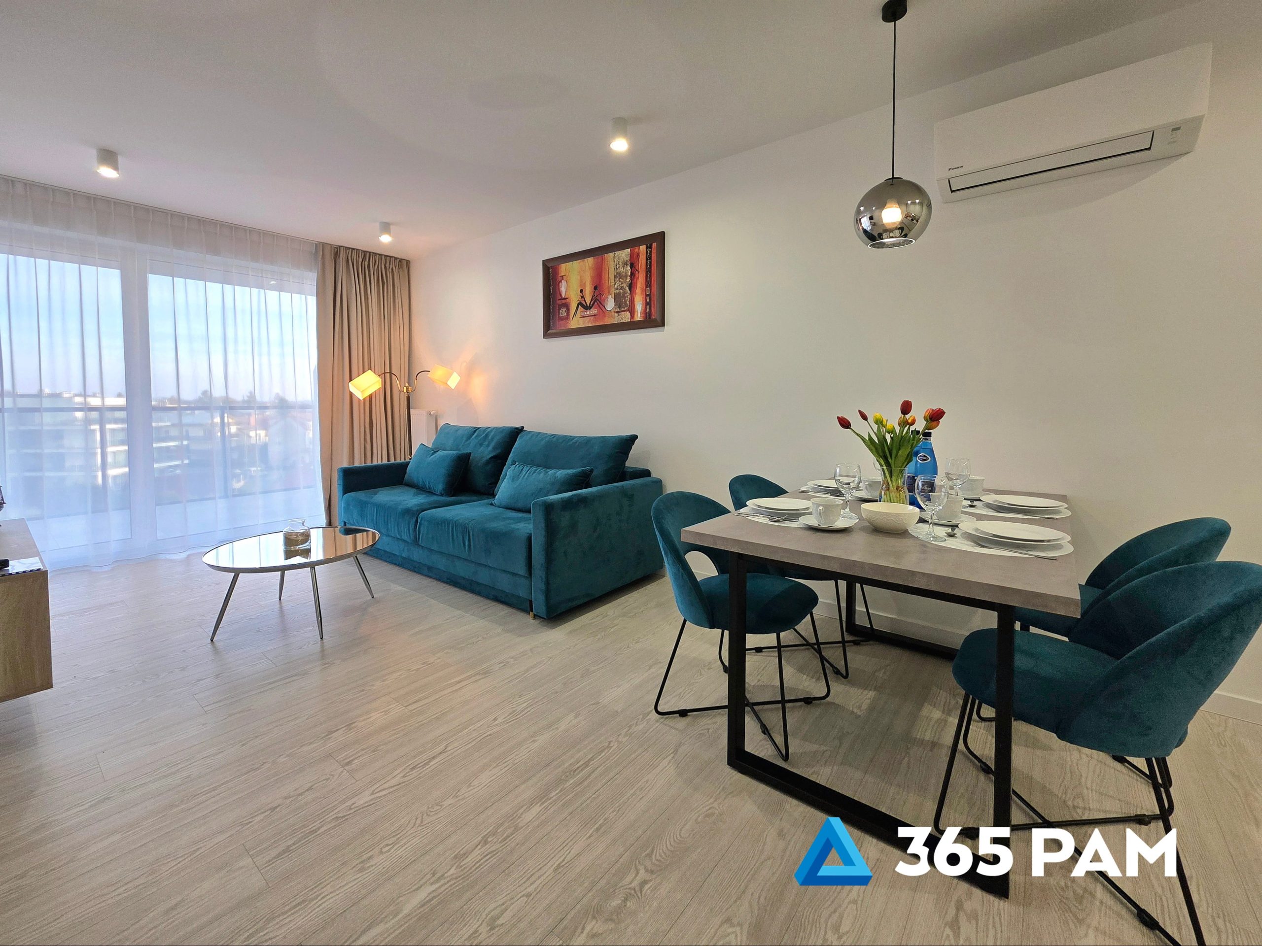 W apartamencie znajduje się komfortowy salon z aneksem kuchennym, przestronna sypialnia oraz nowoczesna łazienka. Wnętrze jest w pełni wyposażone, oferując gościom m.in. wygodne miejsce do wypoczynku, telewizor, bezpłatne WiFi oraz aneks kuchenny z płytą indukcyjną, zmywarką, lodówką i ekspresem do kawy. Do apartamentu przypisane jest również miejsce w garażu, a cały obiekt posiada windę.