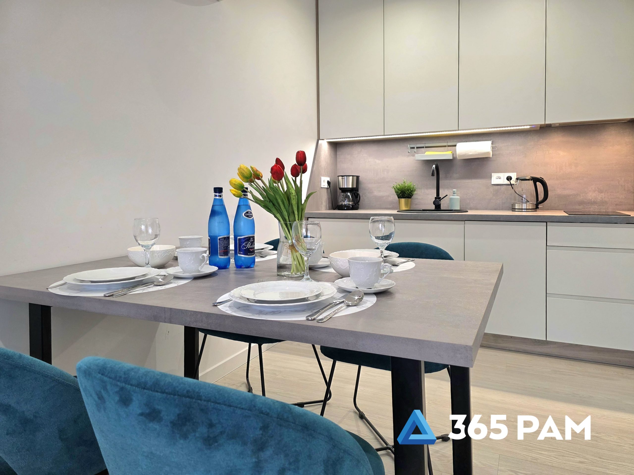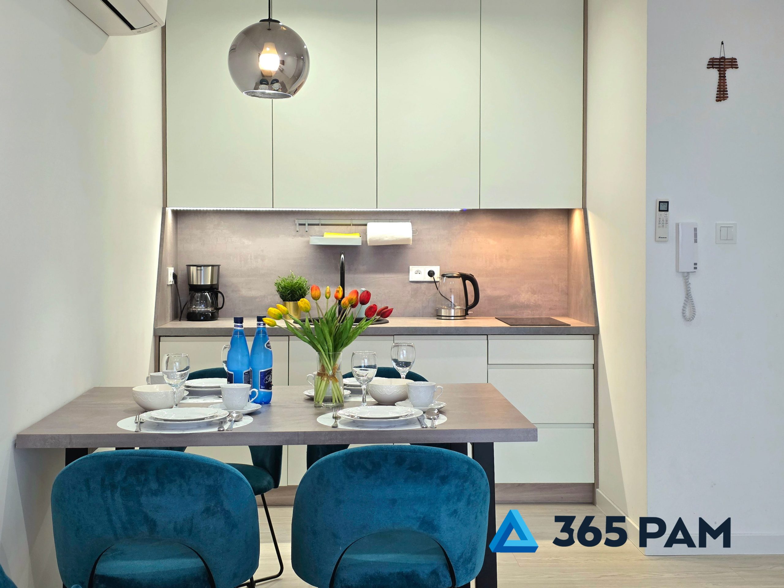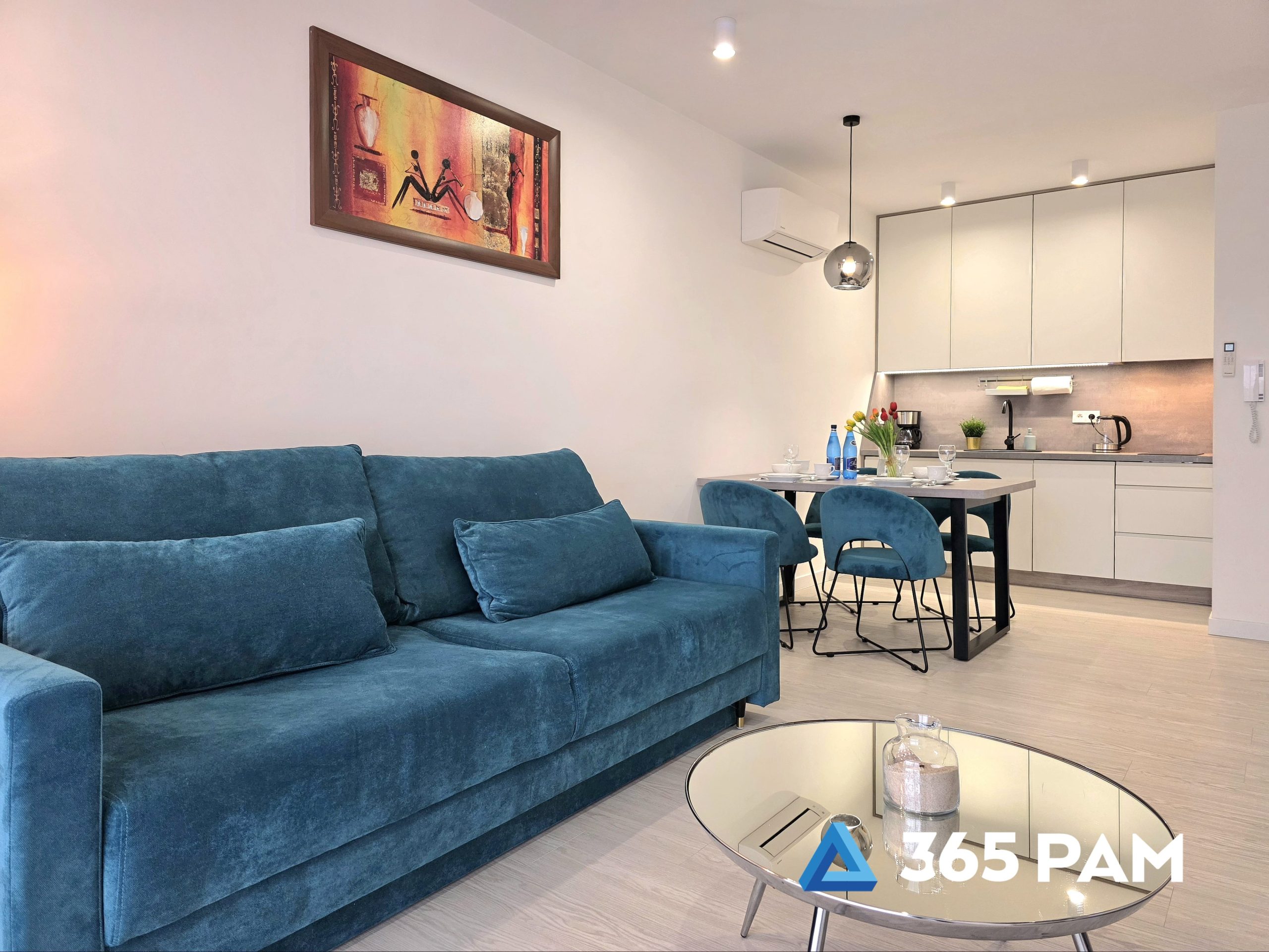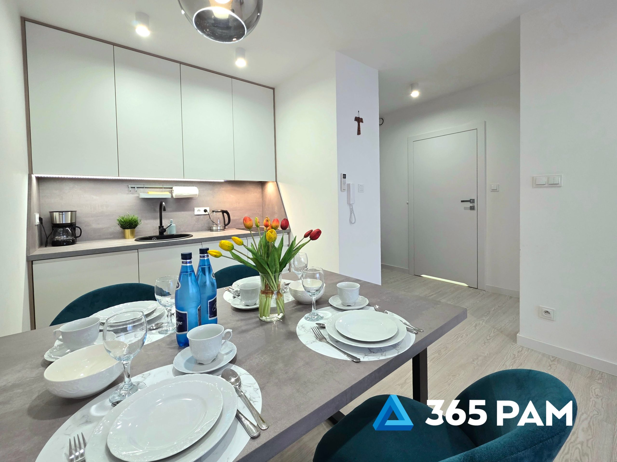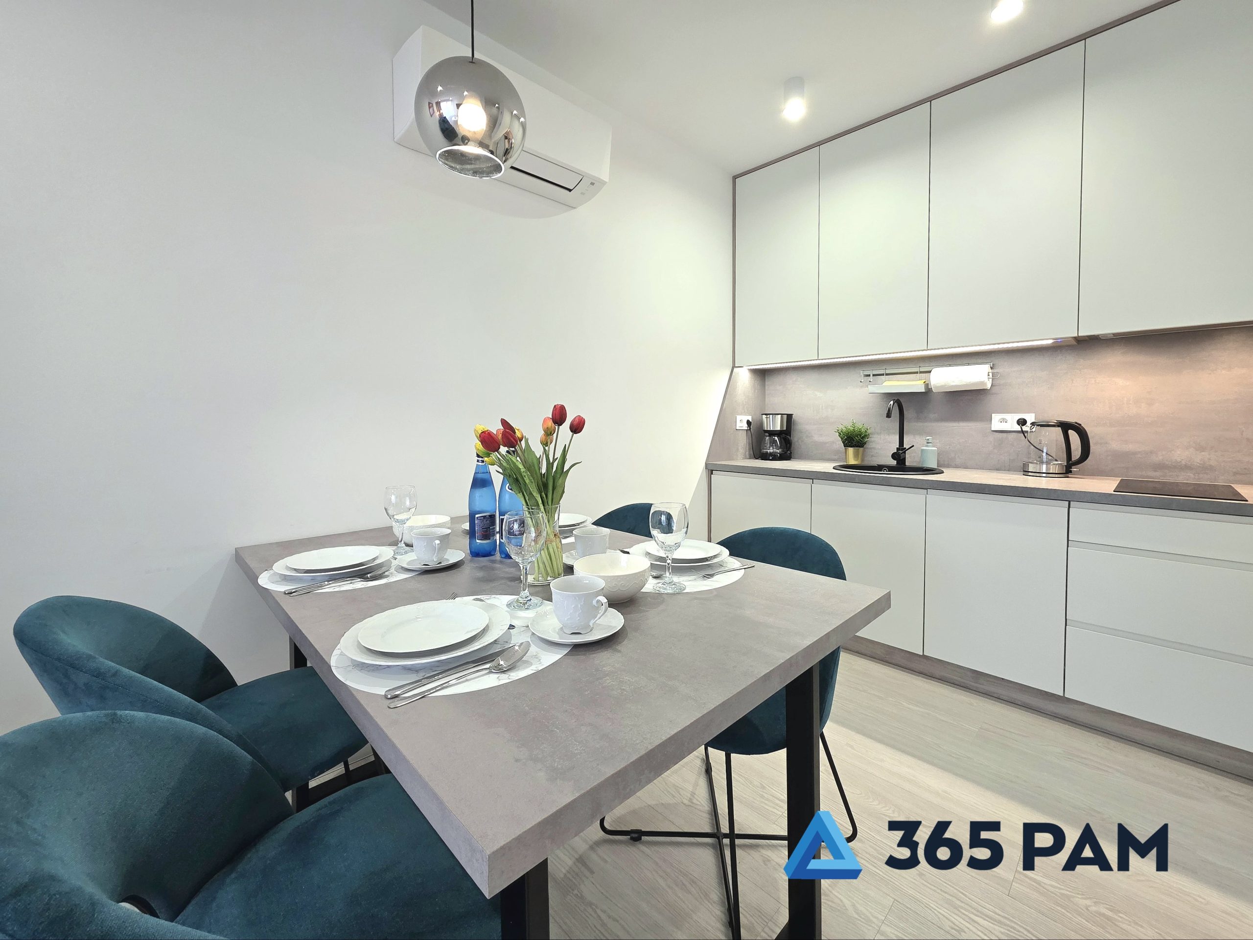 W apartamencie znajduje się komfortowy salon z aneksem kuchennym, przestronna sypialnia oraz nowoczesna łazienka. Wnętrze jest w pełni wyposażone, oferując gościom m.in. wygodne miejsce do wypoczynku, telewizor, bezpłatne WiFi oraz aneks kuchenny z płytą indukcyjną, zmywarką, lodówką i ekspresem do kawy. Do apartamentu przypisane jest również miejsce w garażu, a cały obiekt posiada windę.