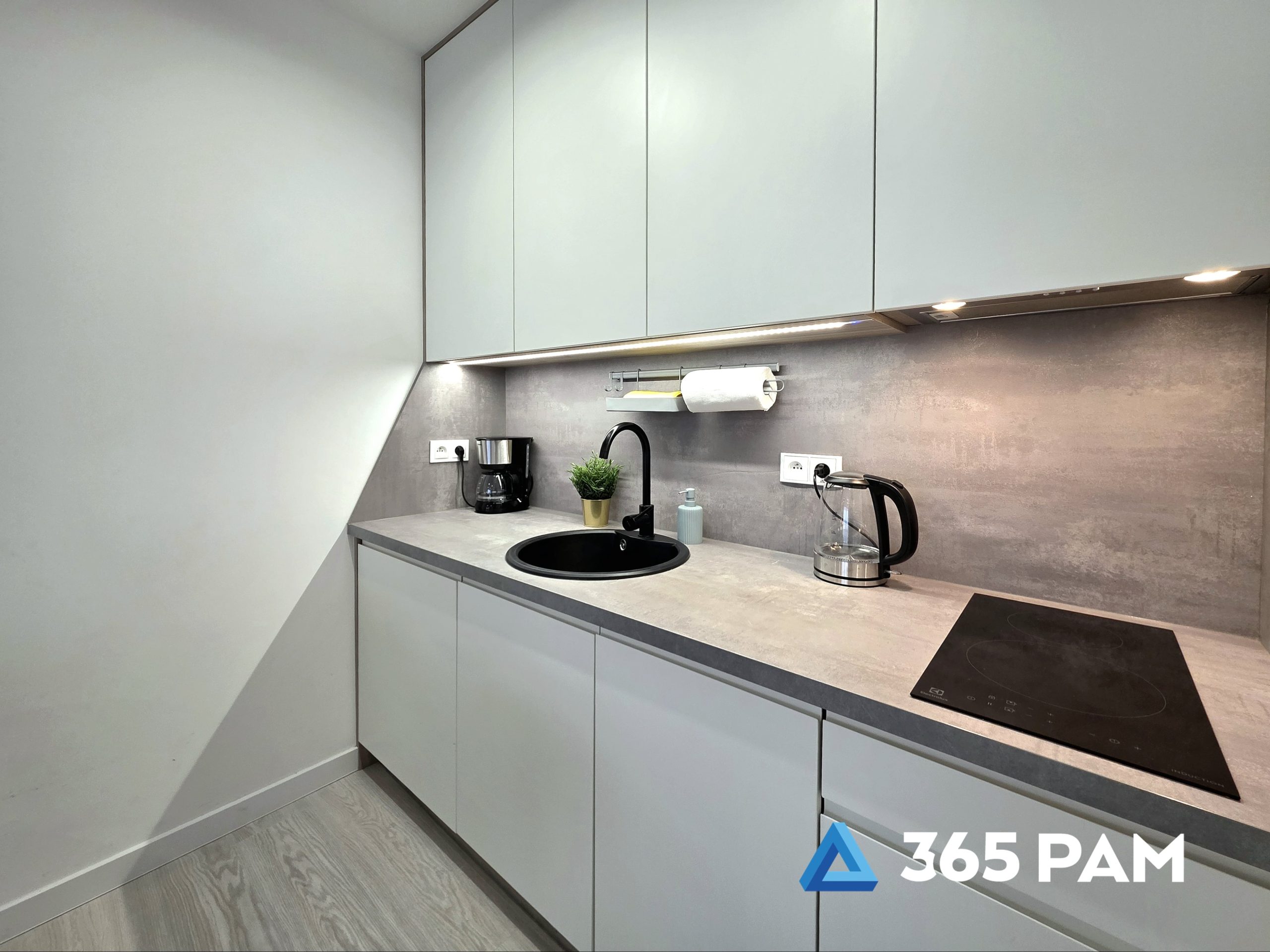 płyta indukcyjna, zmywarka, lodówka, ekspres do kawy przelewowy, przybory kuchenne, zastawa stołowa