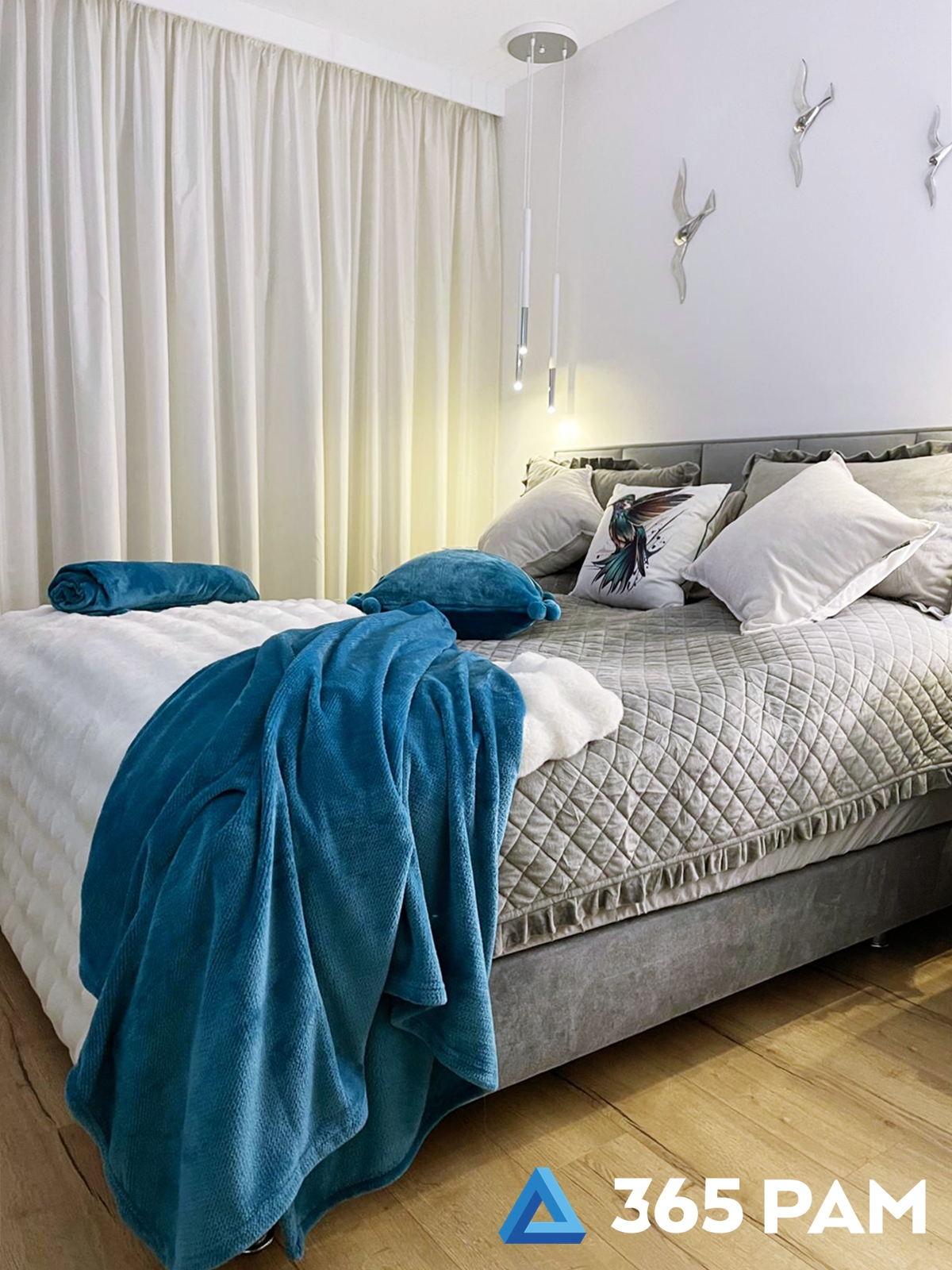 Na wyposażeniu apartamentu znajduje się m.in. telewizor, pralka, zmywarka oraz niezbędne udogodnienia umożliwiające komfortowy pobyt o każdej porze roku. Goście mają również zapewnione miejsce postojowe w garażu podziemnym, co jest dużym atutem w sezonie letnim.