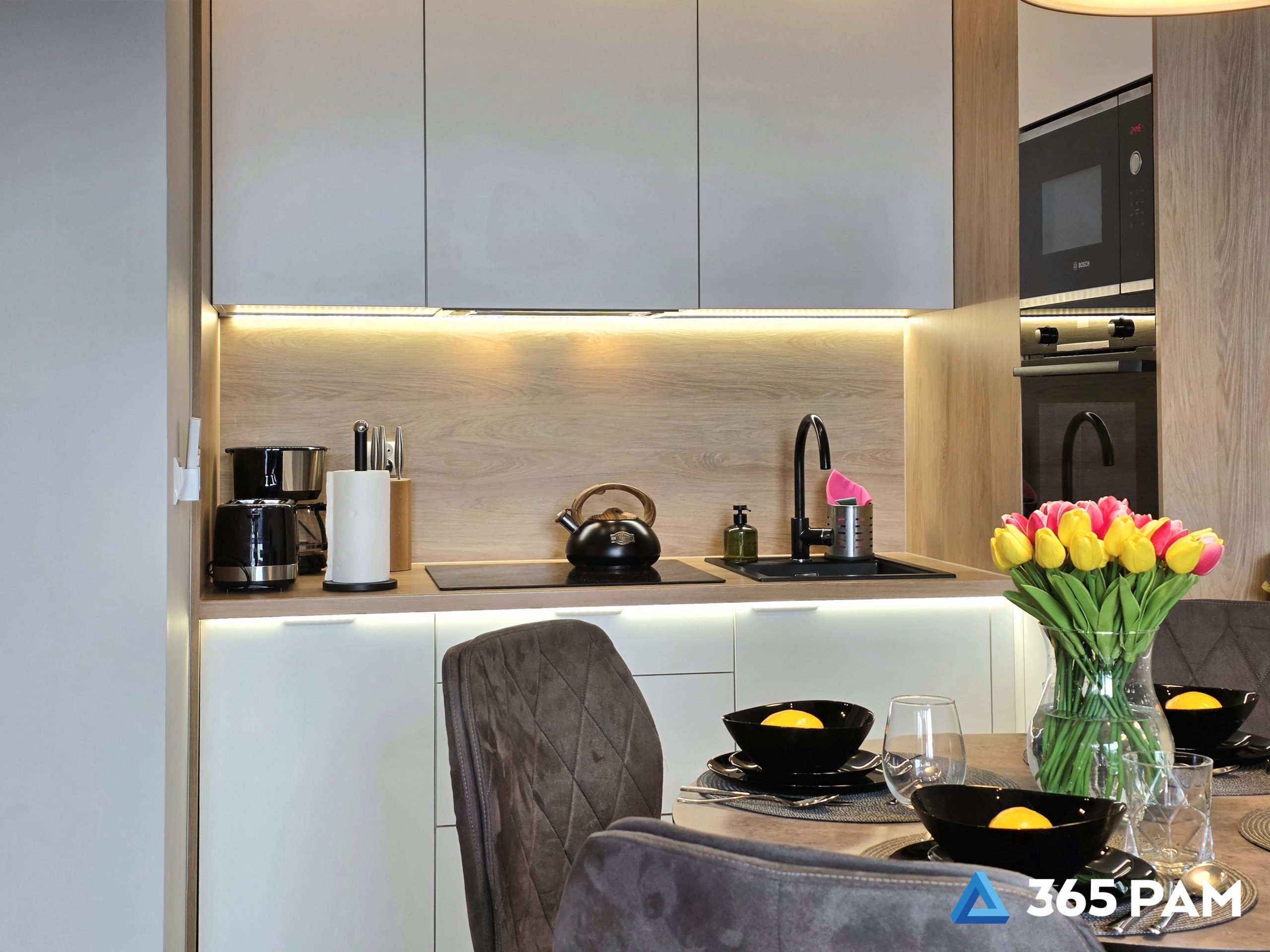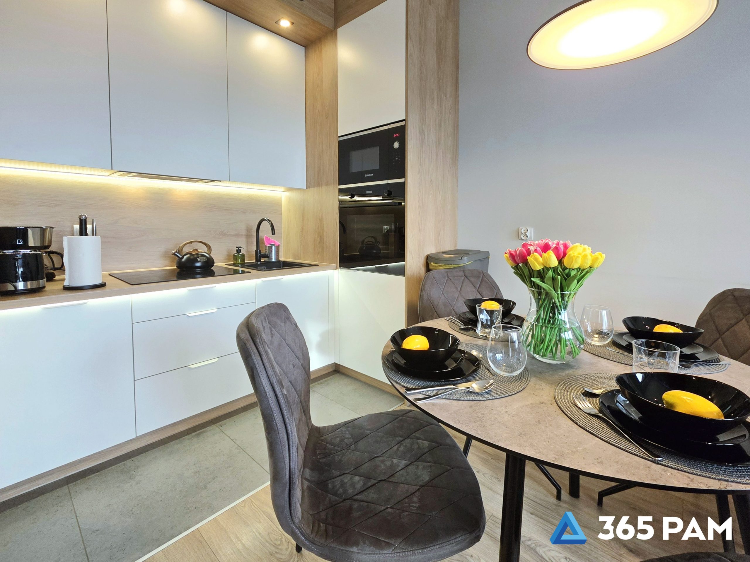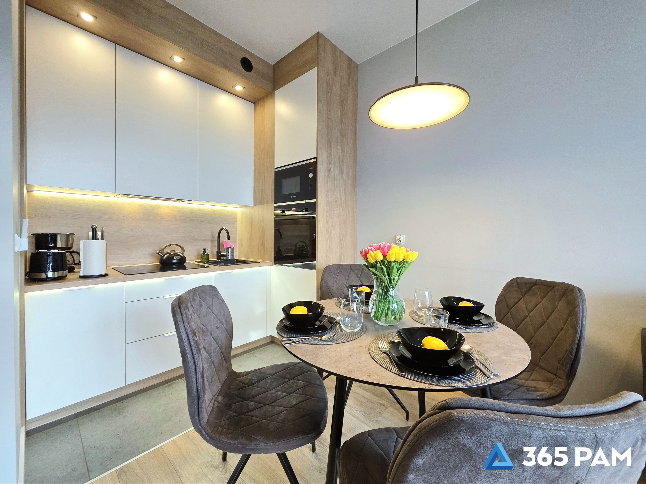 Do dyspozycji gości jest w pełni wyposażona kuchnia, w której znajduje się piekarnik, kuchenka mikrofalowa, płyta indukcyjna, zmywarka, lodówka oraz czajnik, dzięki czemu bez problemu można przygotować posiłki jak w domu.